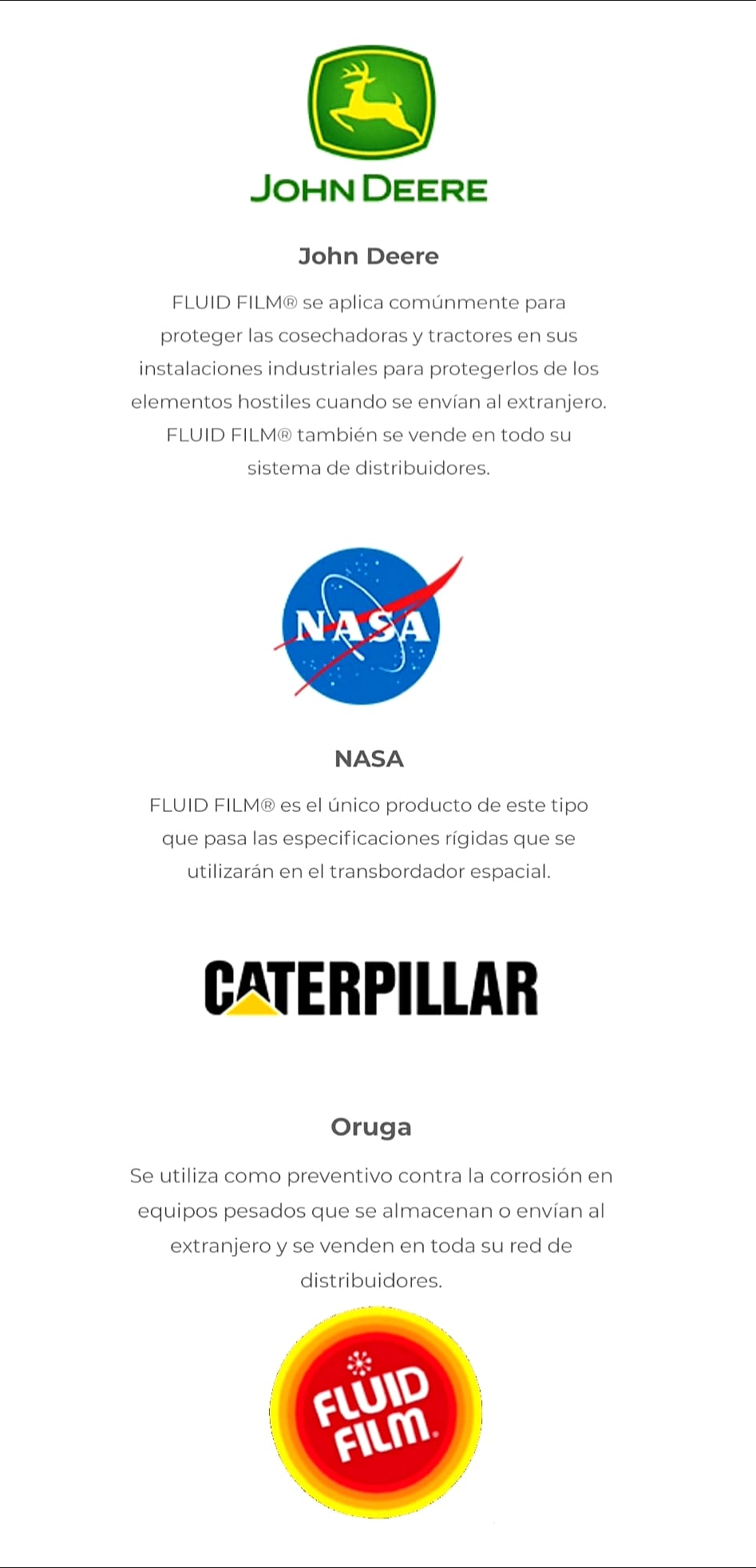 FLUID FILM ® ha demostrado ser tan efectivo en estas industrias que las especificaciones fueron redactadas por la Armada / Ejército / Infantería de Marina de los EE. UU., Sundstrand Aerospace, Boeing North America, la Guardia Costera de EE. UU., La Guardia Nacional de EE. UU., Helicóptero Sikorsky y las aerolíneas Delta para el uso de FLUID FILM ® en una variedad de aplicaciones.