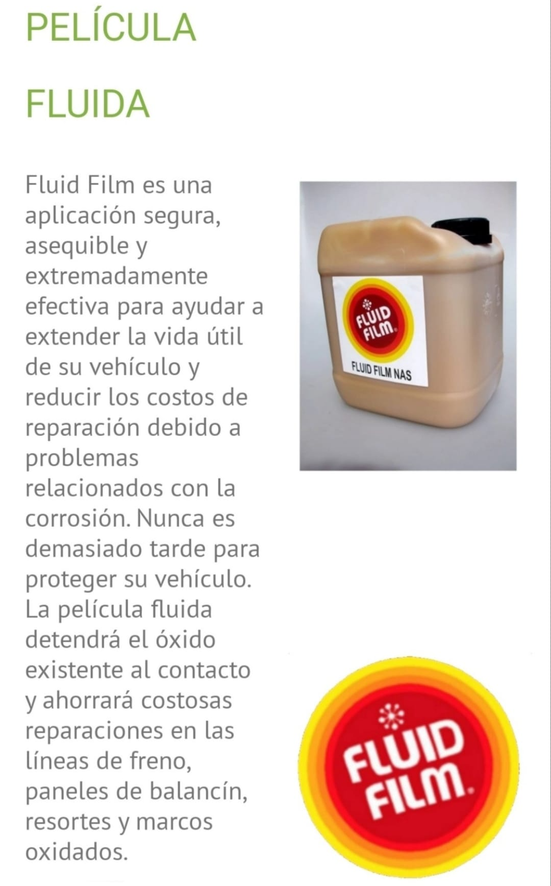 El recubrimiento suave y autocurante de FLUID FILM protege todos los metales, sistemas de cableado y bases de camiones de los efectos de estos productos químicos. Su película resbaladiza y sin secado también proporciona una lubricación duradera para todas las partes móviles y termina con chirridos molestos. La PELÍCULA DE FLUIDO no es soluble en agua, resiste salpicaduras del agua, lodo y lodo durante la conducción.